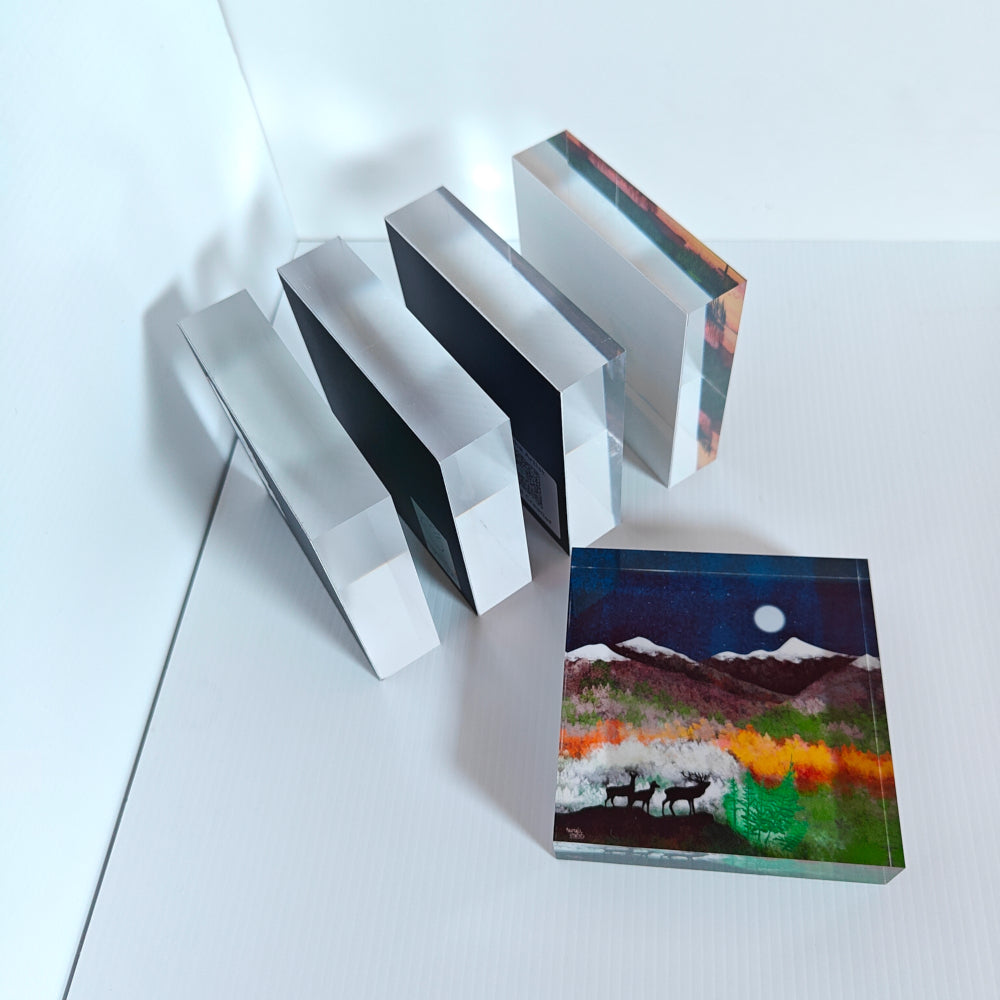 An art block is crystal clear, light and unbreakable. It can be placed anywhere easily and stably. The illustration is behind 2.5 cm thick crystal clear acrylic glass, which enhances the color brilliance, contrast and depth. This medium creates a stunning 3D effect.The art block does not require any mounting materials. Place it on your desk, shelf or any other flat surface. They look great when placed freely in the room! |